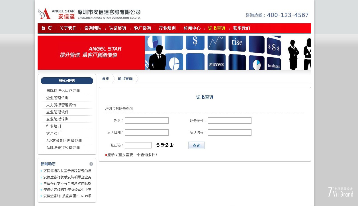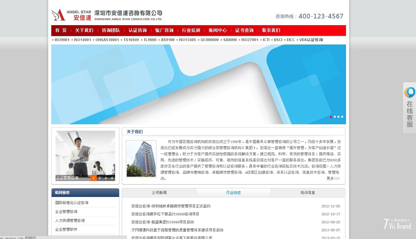 RedService咨询管理服务企业网站模板是七度品牌设计在2013年6月初为深圳市安信达咨询有限公司定制的一套Phpcms v9网站模板,包括首页、认证咨询、业务介绍页面、行业培训、新闻列表、文章页面、关于我们单页、证书查询等页面模版,整体色调采用红与灰的搭配,适合服务类行业用于自身业务项目的推广!该PHPCMS模板采用Phpcms独有的强大灵活的后台管理功能,可以充分满足您对网站各个模块(比如在线留言、在线报名、证书查询)的自定义设置,从而使得网站更具个性化和唯一性,整站代码特别优化非常有利于网站的搜索引擎优化收录,保证网站的优化推广更加简单快捷。