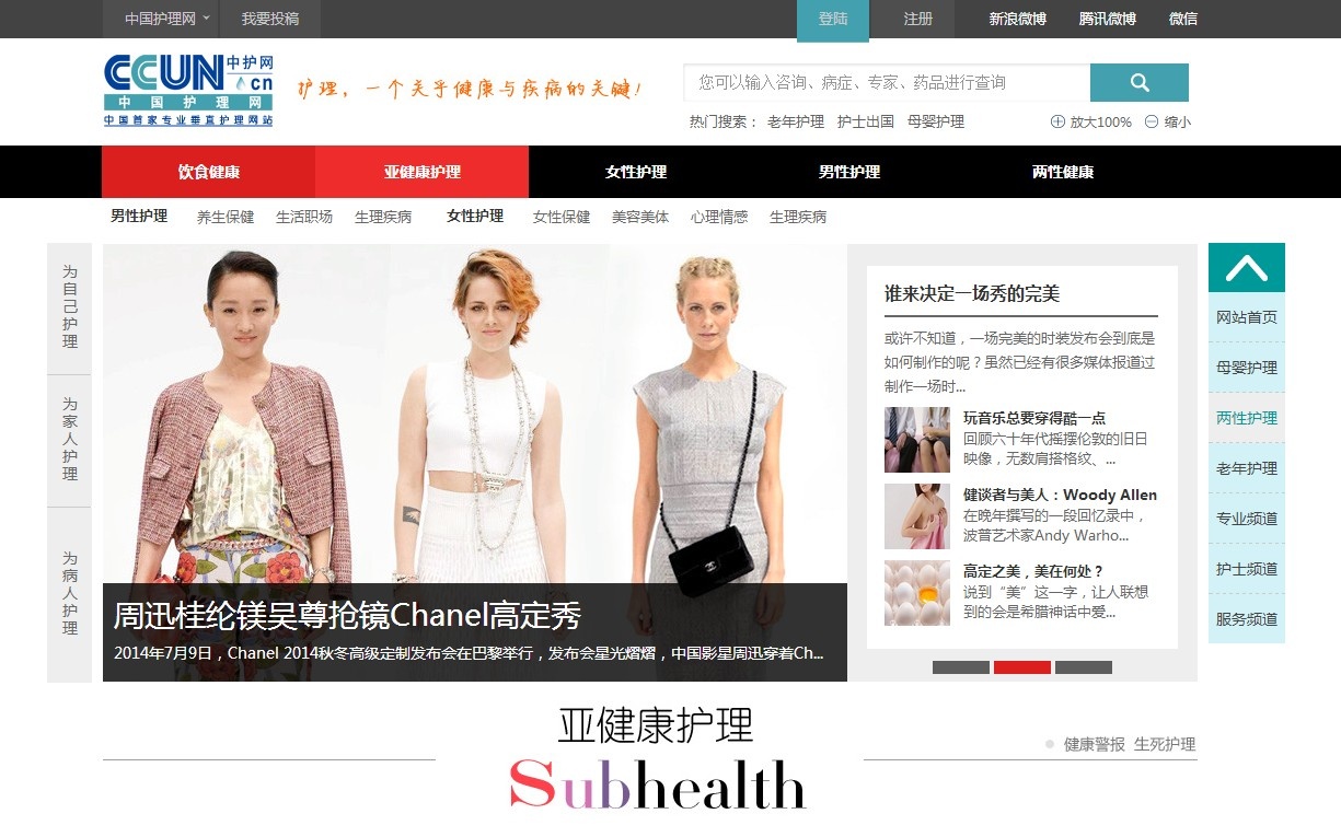 护理行业资讯门户网站——中国护理网是七度品牌设计在2014年7-8月参与定制改版的一个综合型行业门户,网站栏目包括母婴频道、亚健康频道、老年频道、专业频道、护士频道、服务频道等众多频道,不同频道采用不同配色菜单,简洁UI时尚风格,适合服务、科技行业用于行业资讯、综合类型新闻资讯网站。