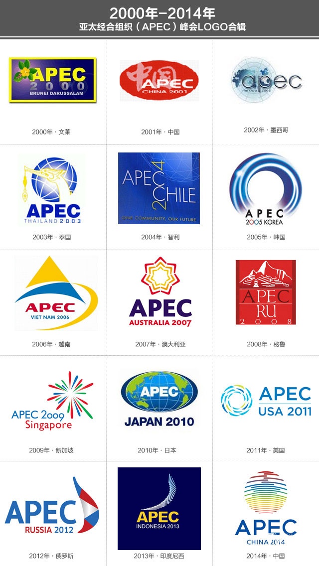 APEC是什么?其实就是一年举行一次的盛大茶话会。由于欧洲一体化的成功,其他地方也开始纷纷效仿。所以继欧洲一体化之后,北美也一体化了。美国、加拿大、墨西哥成立的“北美自由贸易区”。现在就剩下了古老文明的中心亚洲还没有一体化,因此在1989年的时候,由亚洲的太平洋国家牵头建立了亚太经合组织,全称是Asia-Pacific Economic Cooperation,简称“Apec”。今天小编收集整理了2000-2014年APEC峰会使用的LOGO合辑,供各位欣赏。