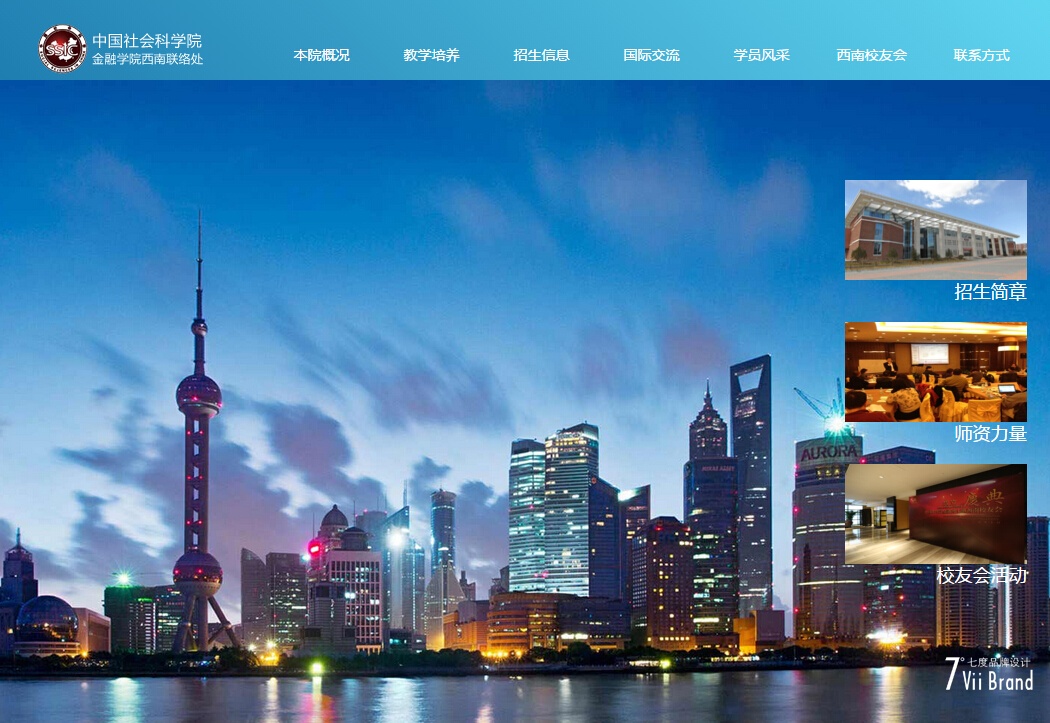 2015年6-7月,七度品牌设计CMSYOU团队为中国社会科学院金融学院西南联络处定制的一套蓝色大气的PHPCMS企业网站,网站包括首页、学院概况、教学培养、招生信息、国际交流、学员风采、校友会等多类别页面模版,整体色调采用科技蓝简洁UI风格,适合学校、大学学院、研究院展示学院新闻、招生信息及学术交流动态信息。